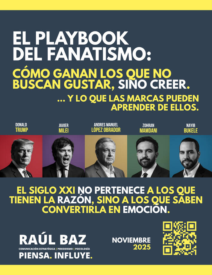 Con la victoria de Zohran Mamdani se comprobó que la emoción sigue siendo la fuerza más poderosa de la política moderna. Lo que empezó como una comparación entre líderes ideológicamente opuestos terminó convirtiéndose en el PlayBook del Fanatismo, un análisis visual y psicológico sobre cómo Trump, Milei, López Obrador, Bukele y Mamdani aplicaron las mismas reglas emocionales para ganar poder y construir creencias colectivas.No es un ensayo académico ni un manual de campaña. Es una lectura estratégica sobre cómo la comunicación, la narrativa y la identidad reemplazaron a la ideología como motores del liderazgo. Dirigido a comunicadores, estrategas, consultores y líderes que buscan comprender la nueva arquitectura del poder, el PlayBook del Fanatismo revela cómo la política del siglo XXI se convirtió en una ingeniería de emociones, atención y algoritmos.Te invito a descargarlo y compartirlo aquí